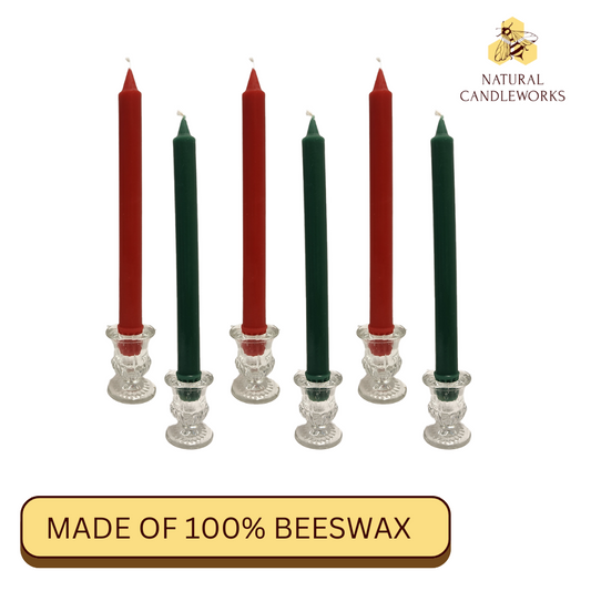 Taper Candles 100% Beeswax Christmas Taper Candle Set – 6 Hand-Poured Candles (3 Red & 3 Green) for Holiday Decor, Table Settings, and Festive Ambiance